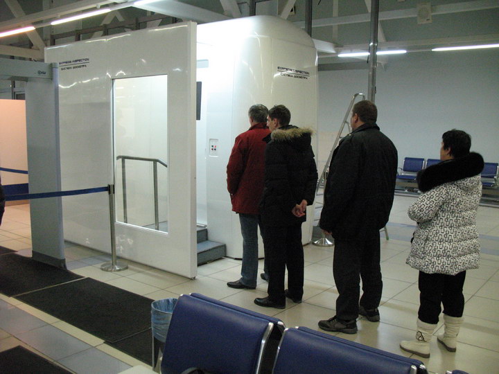 Установка «Сибскан», работающая в аэропорту Толмачёво (Новосибирск). Заметим, что, несмотря на успокаивающие надписи, желающих пройти через нее обычно меньше, нежели через более привычную систему, установленную по соседству