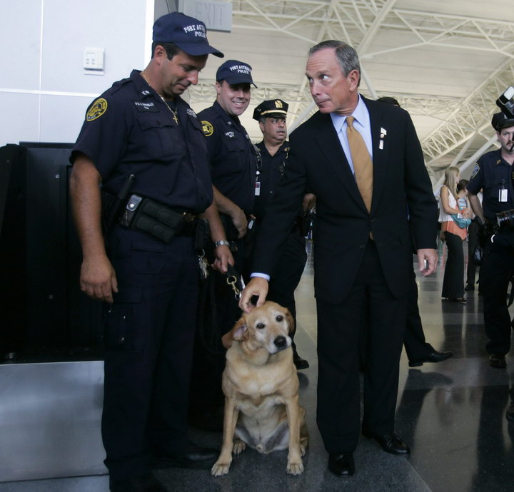 Мэр Нью-Йорка Майкл Блумберг (Michael Bloomberg) поощряет заслуженного сотрудника службы безопасности аэропорта имени Джона Кеннеди