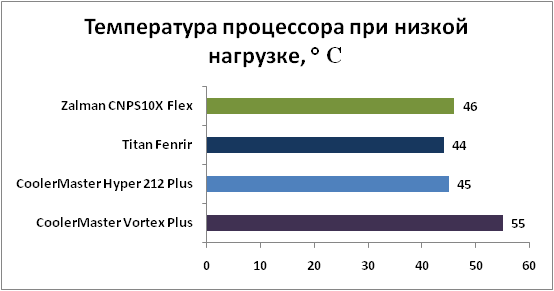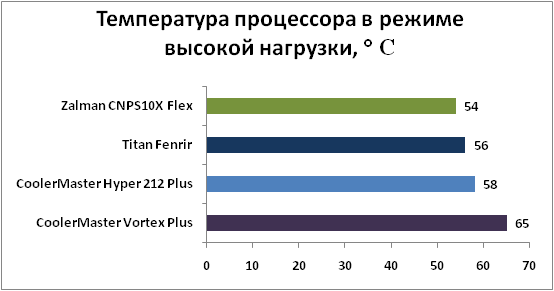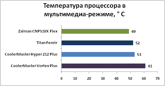 VortexPlus тестировался вместе со штатным 92-мм вентилятором, который поставляется в комплекте, а на остальные радиаторы для тестирования устанавливался 120-мм вентилятор Cooler Master, вращающийся с частотой от 1200 до 1800 об/мин. ![]() В режиме низкой нагрузки Cooler Master Vortex Plus показывает закономерно самый худший результат, но, при этом, он и работает достаточно тихо. Остальные выбранные нами для тестов системы охлаждения выигрывают у Vortex Plus от 9 до 11 градусов. ![]() В мультимедийном режиме дела у героя этого обзора получше, но тоже не совсем хороши: остальные системы обходят его не менее чем на 8 градусов. ![]() В режиме высокой нагрузки на CPU значения всех кулеров становятся еще более близкими друг к другу, но Cooler Master Vortex Plus все равно отстает от остальных, хотя уже всего на 7 градусов. Проигрыш героя этого обзора объясняется достаточно просто – во всем виновата крайне маленькая площадь поверхности радиатора, у всех его конкурентов она в разы больше. При попытке снять вентилятор и протестировать кулеры в пассивном режиме мы столкнулись с абсолютно одинаковым результатом: на открытом стенде даже в режиме низкой нагрузки тестовый процессор перегревался до 95 градусов Цельсия с любым из кулеров. С такой температурой даже в режиме низкой нагрузки о тестировании в остальных режимах пришлось забыть. Глядя на спецификации штатного вентилятора Cooler Master Vortes Plus, в которых указана скорость вращения до 2800 об/мин, мы серьезно опасались, что рядом с кулером будет просто невозможно находиться из-за шума. Однако даже при 37 градусах тепла за окном и максимальной нагрузке на процессор, вентилятор крутился примерно на 2000 об/мин, а без нагрузки сбавлял свои обороты до 1200-1400. За воем вентилятора блока питания, которому в такую жару приходилось несладко, шум кулера Cooler Master Vortes Plus был почти неслышен. Так что, несмотря на потенциальные возможности вентилятора, Cooler Master Vortex Plus получился не слишком громким, хотя и совсем тихим его тоже не назовешь. Тестирование показало, что у Cooler Master Vortex Plus есть и хорошие, и плохие стороны. Со своей первоочередной задачей, то есть с охлаждением процессора, он справляется нормально, но несколько хуже других. Зато он отличается очень удобными креплениями, особенно на платформу Socket AM3/AM2+/AM2, компактными размерами, которые позволяют устанавливать его даже в маленькие корпуса, и умеренной ценой. Cooler Master Vortex Plus хорошо подойдет в качестве не слишком дорогой замены коробочного кулера для тех пользователей, которым не нужны огромные дорогие системы охлаждения и которые не хотят долго мучиться с установкой таких систем.