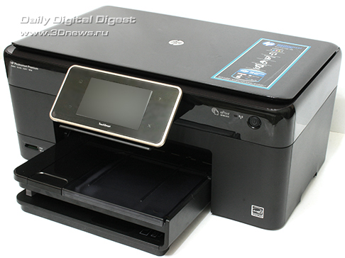 Устройство похоже на HP Photosmart Plus b209a, которое ранее побывало у нас на тестировании, — всё те же лотки для бумаги, те же глянцевые поверхности, да и форма корпуса практически не изменилась. Основное отличие — экран, который стал гораздо крупнее. Увеличились яркость, контрастность, разрешение, радуют углы обзора и цветопередача. В общем, различия видно невооружённым глазом, ведь у HP Photosmart Plus b209a был маленький, блеклый экранчик с низким разрешением и невысокой контрастностью. В остальном устройства вроде бы очень похожи, но всё же мелкие детали выдают принадлежность новинки к более высокому классу. Качество сборки нареканий не вызывает, но вот глянцевая чёрная крышка — это сущее наказание: она маркая и достаточно легко царапается острыми предметами.