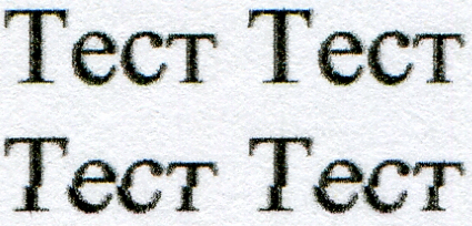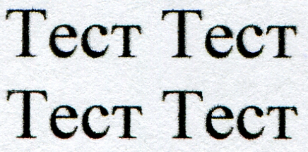 Для проверки скорости было распечатано 10 листов текстового шаблона, полностью заполненного словом «Тест» (шрифт — Times New Roman, кегль — 12, межстрочный интервал — стандартный). В черновом режиме среднее время печати страницы без учёта времени подготовки к печати составило всего-навсего 3,5 секунды. При частичном заполнении в 20, 15 и 10 строчек среднее время печати одной страницы составило 1,9, 1,6 и 1,5 секунды соответственно. Для печати в стандартном режиме при полностью заполненной странице в среднем потребовалось всего 6,0 секунды, а при частичном заполнении — 3,8, 3,5 и 3,2 секунды соответственно. Разница в качестве печати ощутима в основном по цвету, а сам текст при оценке без увеличительного стекла практически не различается и лишь в трех строчках на всю страницу заметно небольшое смещение (фрагмент с смещением приведён чуть ниже). Но в любом случае черновой режим вполне можно использовать для внутреннего документооборота, ведь кроме скорости есть некоторый выигрыш и в расходе чернил. Ниже приведены кроп-фрагменты печати в режимах «быстро» и «стандарт» на обычной офисной бумаге плотностью 80 г/кв.м.