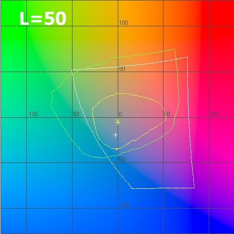 Для оценки цветового охвата принтера использовался спектроколориметр Datacolor 1005, входящий в комплект Spyder3Studio. При помощи данного прибора была построена пара ICC-профилей — для обычной офисной бумаги плотностью 80 г/кв.м и глянцевой фотобумаги HP Premium Plus Photopaper. На базе профилей для обоих использованных типов бумаги был построен график цветового охвата для цветовой координатной системы Lab в координатах ab для светлости L=25, 50 и 75. На иллюстрациях: жёлтая кривая — офисная бумага, зелёная — бумага HP Premium Plus Photopaper, а также для возможности сравнения приведён белый график стандартного цветового пространства sRGB.