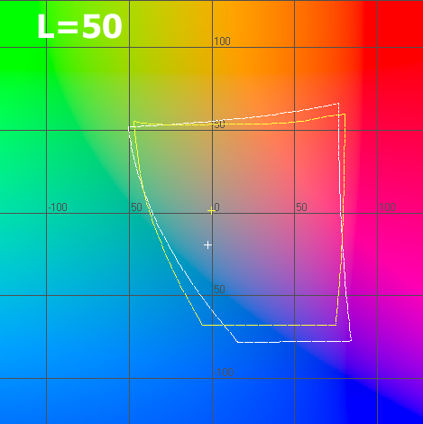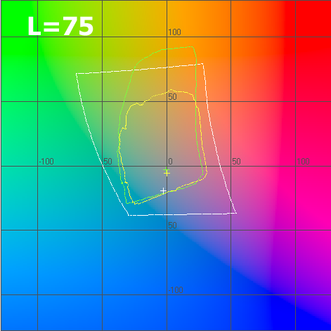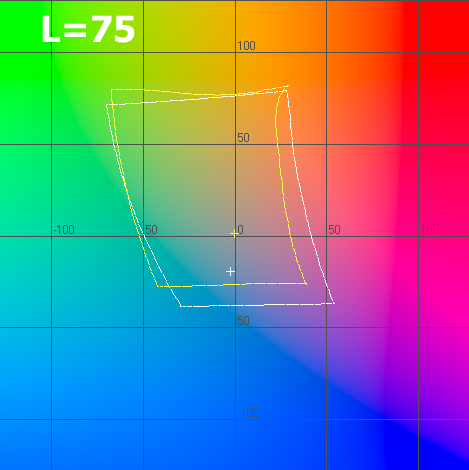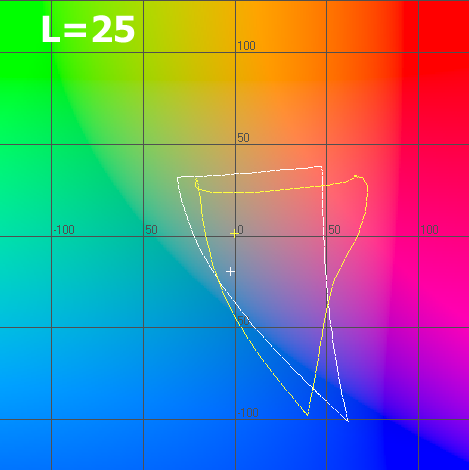 Таблица была отсканирована с разрешением 600 dpi, после чего сохранена в формате TIFF без сжатия. На основании идеализированной модели проверочной таблицы был создан цветовой профиль, который позволил построить графики цветового охвата в системе Lab для координат ab при L, равном 25, 50 и 75. На изображениях жёлтая кривая — график цветового охвата тестируемого сканера, белая — стандартное цветовое пространство sRGB.
