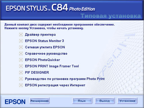 Вместе с драйверами русский интерфейс предлагает вам установить EPSON Status Monoitor, сетевую утилиту EPSON, справочное руководство, EPSON PhotoQuicker, EPSON Print Image Framer Tool, руководство по установке программ Photo Print и программу регистрации EPSON через интернет.