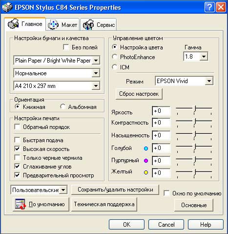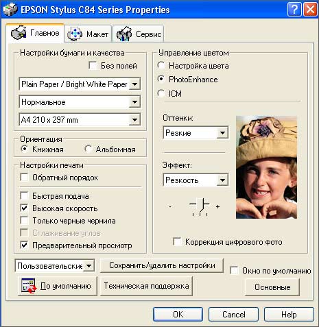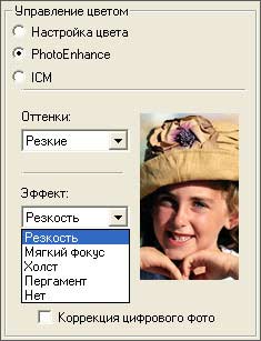 На рисунке выше вы можете видеть, насколько подробно можно настроить печать. Кроме того, управление цветом возможно тремя путями: с помощью обычных настроек яркости, контрастности и т.п. (см. рис. выше); с помощью специальных фотонастроек оттенков и эффектов; и с помощью ICM - Image Color Matching.