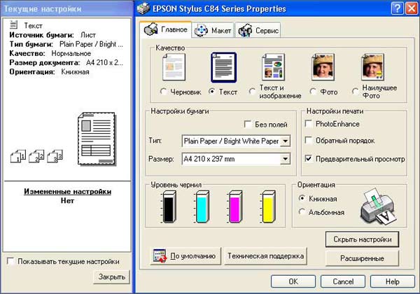 Здесь собраны настройки качества печати (черновик, текст, текст + изображение, фото, наилучшее фото), настройки параметров бумаги, ее ориентация, настройки печати с возможностью выполнения некоторых эффектов при печати, показатели уровня чернил. Настройки печати можно открыть в расширенном режиме.
