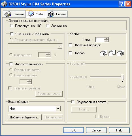 Вторая страница меню печати - это "Макет". Там собраны довольно стандартные настройки печатного листа, описывать которые не имеет смысла - посмотрите на скриншот внизу.