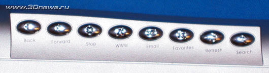 В верхнем ряду клавиатуры находятся 15 мультимедийных и 3 клавиши питания. Разделены мультимедийные клавиши на 2 группы. 8 Интернет клавиш (Stop, My Favorites, Refresh, Search, Forward, Back, E-mail, WWW) и 7 мультимедийных (Mute, Volume Up, Volume Down, Previous, Play/Pause, Next, Stop).