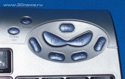 Над цифровым блоком расположился блок управления мультимедиа(Mute, Volume Up, Volume Down, Previous, Play/Pause, Next, Stop). Между Интернет и Мультимедиа клавишами расположены две кнопки питания(Power Off, Sleep).