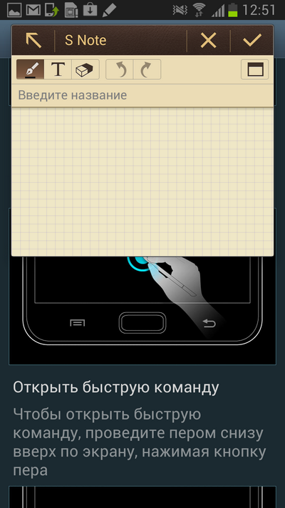 В общем, с камерой у Galaxy Note 2 не все хорошо. Здорово, что она делает хорошие снимки при правильных параметрах, но до настроек при съемке на телефон доберется один процент снимающих, у остальных же фотографии будут не самого высокого качества. ⇡#Перо S PenОдной из главных фишек первого Galaxy Note в Samsung называли ручку S Pen (корейцы настаивают: «Это не стилус, это S Pen!») и, соответственно, экран Wacom, способный с этим пером работать. То, что многие за время использования «плафона» ни разу не достали перо из его посадочного места, корейцев не смутило — в Galaxy Note 2 также есть S Pen, дополненный и улучшенный. Начать стоит с того, что само перо стало толще — теперь аж 8 мм в диаметре (назовем это диаметром, хотя перо и не круглое в сечении), так что его почти удобно держать в руках. На пресс-конференции говорили что-то про резиновую накладку для дополнительного удобства — но на доставшемся нам S Pen ее по каким-то причинам не было. Распознается 1024 уровня силы нажатия, в то время как у оригинального Note было всего 16. На глаз, впрочем, определить количество этих градаций сложно. Более того, теперь «плафон» ощущает присутствие пера, даже если не касаться дисплея, а лишь поднести S Pen к экрану на расстояние около половины сантиметра. Эта особенность получила наименование Air View и обросла некоторым количеством программной поддержки: так, скажем, если поднести перо к уменьшенному изображению в галерее, то оно немного увеличится. Вообще, аппаратные изменения — мелочь по сравнению с количеством программных наворотов, которых не было в первом Note и которые появились во втором. Если перечислять все — можно нечаянно написать вторую полновесную статью, так что пройдемся по главным из них. 1. Easy Clip – возможность обвести произвольное изображение на экране, после чего оно копируется в буфер обмена. Оттуда его можно прикрепить, скажем, к письму. Правда, в Gmail вставить не получится — работает только с фирменным почтовым клиентом Samsung. Так что отличная, в общем-то, фишка пока применима не везде, что печально.  2. Жесты. На S Pen есть целая одна кнопка — и она там не просто так. Если ее зажать — «плафон» начинает воспринимать некоторое количество жестов. Например, возврат назад — если нарисовать загогулину одной формы, вызов меню — загогулину другой формы. Собственно, Easy Clip тоже относится к такого рода жестам. Помимо перечисленного, можно сделать снимок экрана, просто зажав кнопку, ткнув пером в экран и немного подержав. Ну и еще одна возможность — проведя пером с зажатой кнопкой снизу вверх, можно вызвать так называемое меню быстрых команд. 3. Быстрые команды. На самом деле, про «быстрые» – это кто-то пошутил. Надо сначала провести пером через весь экран, в появившемся окне нарисовать символ, к которому привязана та или иная команда, еще секунду он будет распознаваться — и только после этого действие, которое вы хотели выполнить, наконец-то будет выполнено. При условии, конечно, что жест был распознан правильно. То есть в целом это занимает не так уж мало времени.    Удобно же то, что вызывать меню быстрых команд можно откуда угодно, более того, команды можно создавать самому. Скажем, можно нарисовать символ ноты и повесить на это вызов музыкального проигрывателя. Правда, его быстрее вызвать, нажав на соответствующую иконку, но прикольно же. Поддерживаются и своего рода макросы — можно не просто