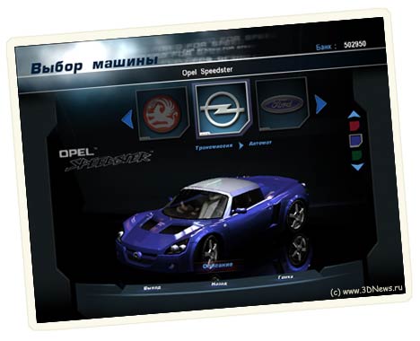 Весь парк побит на идеологически понятные составляющие - на выбор немки, и американки, а также просто куски тюнинговой и дизайнерской мысли от ведущих ателье мира. Ferrari, Lamborghini, McLaren - кому ничего не говорят эти имена, просьба встать и выйти из зала. Истинные арийцы зажигают на Opel, Mercedes и BMW, дети прерий берут в свои руки Ford, Dodge и Chevrolet. Всё перечислять нет смысла - ведь лучше один раз сесть и поехать, чем сотню раз услышать. Нет японок, причём совсем. Видимо дефицит, и рост пошлин на девелоперской таможне. Поэтому, сравнить в игре ///M5 с EVO-7 не удастся. Может и к лучшему.