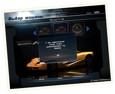 При первом знакомстве не дают. Нужно пройти конкурс за конкурсом, заезд за заездом. В финале одного из них садимся в McLaren F1. Даже после Lamborghini Murcielago, на пару с Porsche Carrera GT, эту гашетку нажимать страшно. А страх себя оправдывает, ой оправдывает... Едет киса так, что руки на руле покрываются холодной испариной, а с губ срываются выражения, Ожеговым в анналы не внесённые. Времени смотреть вокруг нет, главное - успеть вовремя топнуть в пол тормоз, дёрнуть ручник и лихорадочно выкрутить руль в сторону, противоположную отбойнику. И пусть рулится F1 лучше чего бы то ни было, зато и втыкает по самые Нидерланды, да так, что даже на автобане катки R20 удержать это чудо в повороте не могут ну никаким образом.