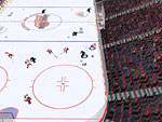 Впрочем, прервемся. Несмотря на невиданную уникальность и твердое знание законов физики, система столкновений иногда все же выдает форменные коленца. У примеру выход один на один и передача шайбы на игрока у противоположной штанги. Если он стоит недвижимо или делает мелкие колебательные движения отгоняя от себя надоедливых защитников, то все прекрасно. Но если два наших бравых нападающих идут параллельными курсами... После передачи шайбы и удара в одно касание, маленький черненький кружечек неожиданно может взмыть почти под потолок. С метра до ворот вираж получается такой, что шайба не то что под перекладину, она идет выше защитных стекол на заднем плане, составляя в дальнейшем для кого-то из зрителей на трибунах прекрасный трофей-сувенир.