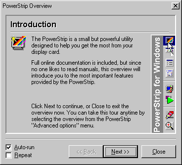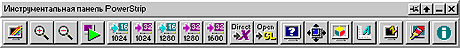Обратите внимание на два окошка внизу - первое с надписью Auto-run служит для автоматического старта программы при запуске Windows, выделение чекбокса Repeat вызовет возвращение первой темы справки при перезапуске программы. Интерфейс справки не переведен, однако с клавишами Back (назад), Next (далее) и Close (закрыть) сумеет разобраться даже начинающий пользователь. Нажатие кнопки Close не приведет к закрытию программы, а лишь активирует основной интерфейс убрав справку. Основной прелестью PowerStrip является панель быстрого вызова функций: