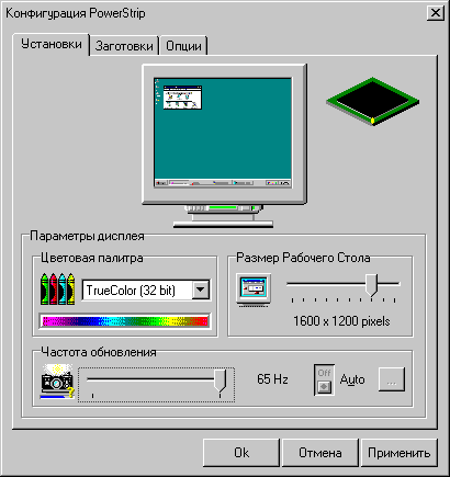 Меню основных настроек PowerStrip состоит из трех закладок - "Установки", "Заготовки" и "Опции".