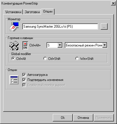Закладка с опциями PowerStrip позволяет быстро выбрать монитор из списка доступных, задать горячие клавиши для вызова следующих функций: