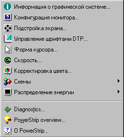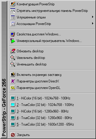Меню PowerStrip в панели задач активируется нажатием одной из кнопок мыши на специальной иконке и выглядит следующим образом: