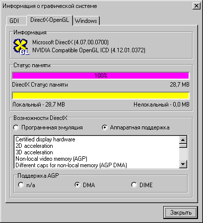 | Информационное меню "Информация о графической системе" выведет подробный отчет о состоянии видео-адаптера и используемых им ресурсах. | |