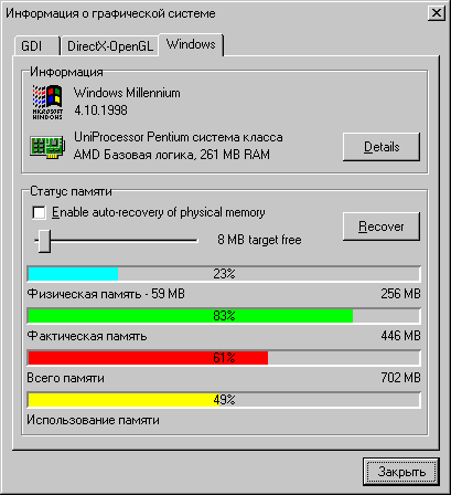 По непонятным причинам в раздел информации вынесен очень полезный инструмент - очистка физической памяти. Задав полозком желаемый обьем и нажав на Recover вы заставите PS постараться очистить для вас это количество оперативной памяти. Мы не рекомендуем пользоваться автоматическим восстановлением, так как оно может происходить в самые неожиданные моменты (например во время ответственного матча в Quake 3 Arena). Индикаторы свободной физической, фактической, общей памяти и ее использования помогут отследить изменения при работе программы.