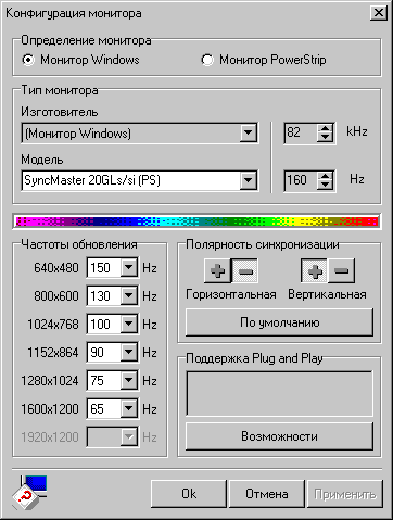 Активировав чекбокс "Монитор PowerStrip" вы получите возможность либо выбрать монитор из списка, при этом задействовав два выпадающих меню - "Изготовитель" и "Модель". Панель очень удобно организована и позволяет задать стандартные частоты из выпадающего меню, изменить полярность синхронизации. Одной из удобнейших опций PowerStrip является опрос PnP монитора по DDC2B каналу, что позволяет выяснить его характеристики не имея INF файла. К сожалению многие производители часто занижают возможности своих мониторов, что приводит к ситуации, когда во всех рабочих режимах монитор имеет одинаковую частоту обновления. Как пример можно привести 17-ти дюймовые мониторы Sony, которые по умолчанию настроены на 85Hz во всех режимах где они это поддерживают. Если для мониторов с диагональю 17" это еще не так заметно, то 85Hz на 20" или большего размера мониторе уже можно определить глазом по еле заметному мерцанию. Мы рекомендовали бы использовать для продолжительной работы с текстом на CRT дисплеях режимы с частотой обновления более 85Hz.