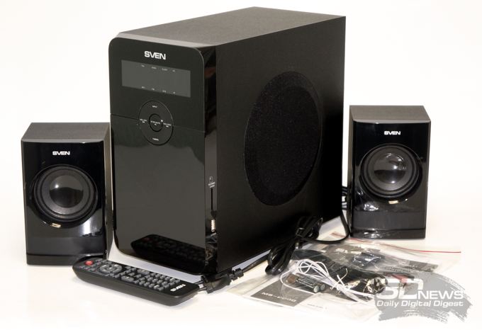 Рассмотрим поближе конструкцию музыкального центра SVEN MS-2000. Комплект поставки состоит из сабвуфера с интегрированной электронной "начинкой", двух колонок-сателлитов, пульта ДУ с двумя батарейками ААА, сигнального кабеля, антенного провода (для тюнера), комплекта для настенного крепежа сателлитов, руководства по эксплуатации и гарантийного талона.