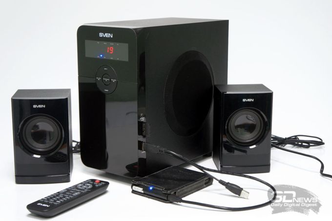 Вполне возможно, именно так рассуждали разработчики нового 2.1-канального цифрового музыкального центра MS-2000 из компании SVEN. Что из источников хорошего звука можно назвать настолько актуальным на сегодняшний день, чтобы оно заслуживало размещения в такой системе? Аудио-кассеты нам, понятное дело, уже давно не нужны, да и компакт-диски по большому счёту тоже можно назвать устаревшим анахронизмом. Зато высококачественное радиовещание на ультракоротких волнах в диапазоне FM, стареть не собирается, равно как любая цифровая музыка, записанная на действительно популярных носителях. Вероятнее всего, модель MS-2000 (кстати, называемая в SVEN "музыкальной шкатулкой") именно из этих соображений и обзавелась встроенным FM-тюнером, а также мультимедийным плеером с поддержкой USB-накопителей и флеш-карт стандарта Secure Digital (SD).