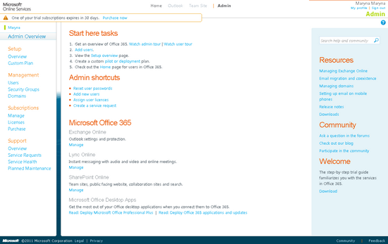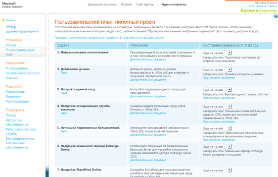 Для администрирования сервиса используется достаточно понятная панель управления в браузере. С ее помощью администратор компании может добавлять новых пользователей, управлять лицензиями, а также обращаться в службу технической поддержки Microsoft. Предлагается один из двух вариантов работы сервиса: в «облаке» или же на собственном сервере. Очевидно, что второй вариант предусмотрен для тех компаний, для которых важен максимальный уровень безопасности и поэтому удаленное хранение данных недопустимо. Интересно, что Office 365 предусматривает переход с удаленного на собственный сервер и обратно.
