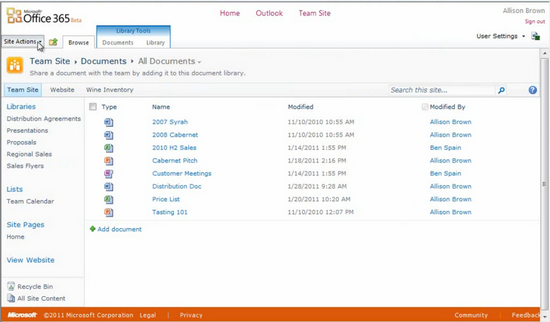 SharePoint размещает файлы в собственном хранилище, которое называется «библиотекой». Для документов, загруженных в SharePoint Online, доступен полнотекстовый поиск. Office 365 поддерживает инструмент SharePoint Workspace, благодаря чему можно работать с документами, хранящимися на сервере, даже при отсутствии связи с Интернетом. Как только связь восстанавливается, данные синхронизируются.