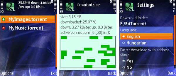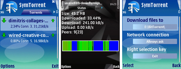 Разработка венгерских специалистов, распространяемая с открытыми исходными кодами и позволяющая превратить любой мобильник с поддержкой JavaME в совершенно бесшумный BitTorrent-насос. Приложение характеризуется простотой реализации, минималистичным интерфейсом и умением выполнять свои обязанности на устройствах нижнего ценового диапазона. Пользователь программы может управлять списком загружаемых файлов, отслеживать скорости скачивания и отдачи данных, оценивать объем сохраненной информации и выполнять ряд других незамысловатых задач. Единственное ограничение связано с размером копируемых из Сети объектов: в силу лимитированного объема виртуальной памяти, отводимой под Java-мидлеты, на некоторых телефонах при загрузке увесистых файлов приложение может рапортовать об ошибке Out of memory. Также следует иметь в виду, что для запуска MobTorrent необходим аппарат, Java-платформа которого отвечает изложенным на странице разработчиков требованиям и нормам стандарта JSR-75, обеспечивающего приложениям доступ к файловой системе портативного устройства. ![]() SymTorrent