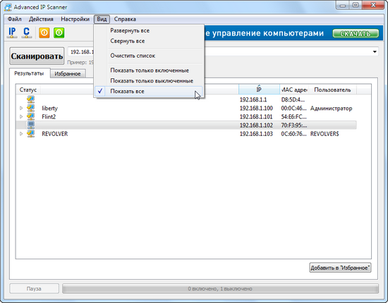 Проверяя заданный диапазон IP-адресов, сканер показывает не только обнаруженные IP-адреса и имена удаленных компьютеров, но также предоставляет информацию об уникальном идентификаторе сетевого интерфейса — MAC-адресе. В отчете Advanced IP Scanner могут отображаться все обнаруженные устройства, только включенные или только выключенные. Для удобства их можно сортировать по любым признакам: по статусу, имени компьютера, IP-адресу, MAC-адресу и так далее.