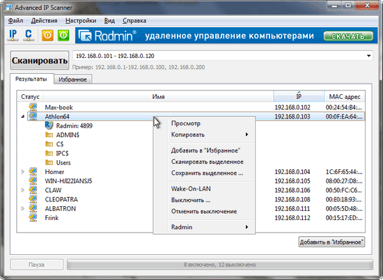 В общем, Advanced IP Scanner не обладает какой-либо сверхъестественной функциональностью, зато позволяет по-настоящему упростить работу системного администратора, причем интеграция с Radmin значительно расширяет возможности программы, а главное, делает жизнь сисадмина еще проще.