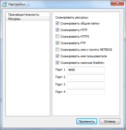 То, какие именно ресурсы будут сканироваться, задается в настройках программы. Тут можно включить анализ тех ресурсов и информации, которые отключены по умолчанию: HTTPS, имени пользователя, имен и групп NETBIOS. Кроме этого, можно задать дополнительные порты, которые будут проверяться программой при сканировании.