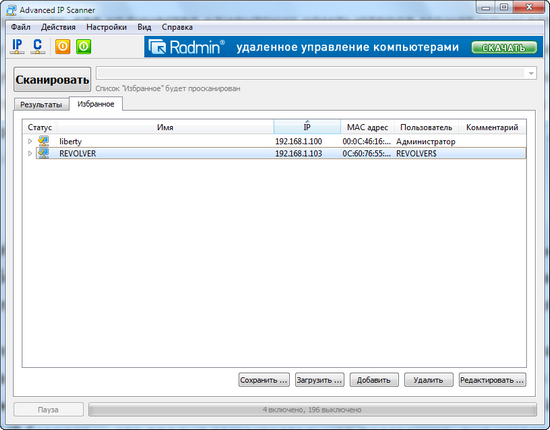 Компьютеры, добавленные в этот список, можно сканировать отдельно от остальных. Когда необходимо работать с двумя, тремя и более группами, списки избранного сохраняются в виде отдельного файла, который можно загружать в Advanced IP Scanner по мере надобности.