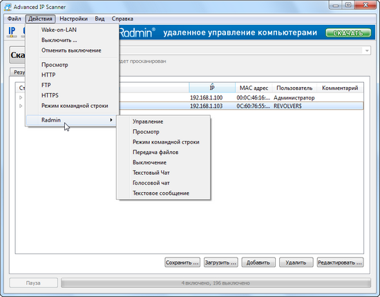В отчете, составляемом Advanced IP Scanner согласно результатам сканирования, показывается информация о компьютерах, на которых уже установлено программное обеспечение для удаленного администрирования от «Фаматек». Прямо из окна приложения можно быстро начать сеанс удаленного администрирования посредством Radmin. Для этого на удаленном и локальном компьютерах должны быть установлены соответствующие утилиты — сервер и вьювер (стоит отметить, что вьювер бесплатен). Наличие Radmin на компьютерах локальной сети открывает массу дополнительных возможностей перед пользователем Advanced IP Scanner. Можно прямо из окна утилиты открывать сессию Telnet, использовать текстовый или голосовой чат для общения с другими пользователями, передавать файлы на удаленный компьютер.