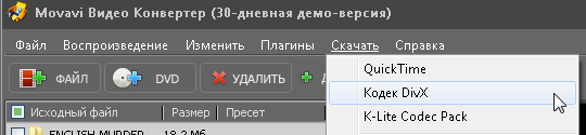 В программе можно выполнять и обратное действие — склеивать выбранные фрагменты. В случае отсутствия в системе какого-нибудь важного кодека его можно скачать, перейдя по ссылке прямо из меню «Movavi Видео Конвертер».