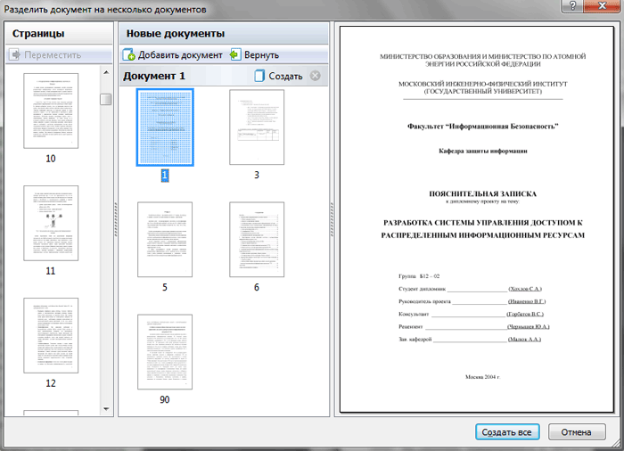 Претерпели изменения в FineReader 11 также средства редактирования и проверки документов. Из наиболее значимых новшеств можно отметить механизм разделения пакета страниц на несколько документов. Данная функция может быть полезна при сканировании в едином потоке разнородных материалов (газетные вырезки, журнальные статьи, сканы книжных страниц и так далее), для каждого из которых необходимо использовать различные настройки OCR-движка. Сортировка осуществляется простым перетягиванием мышью миниатюр страниц в окне «Разделить документ на несколько» и последующим нажатием клавиши «Создать» (см. скриншот). В результате для каждого набора страниц запустятся отдельные копии FineReader с независимыми друг от друга параметрами распознавания текстов.