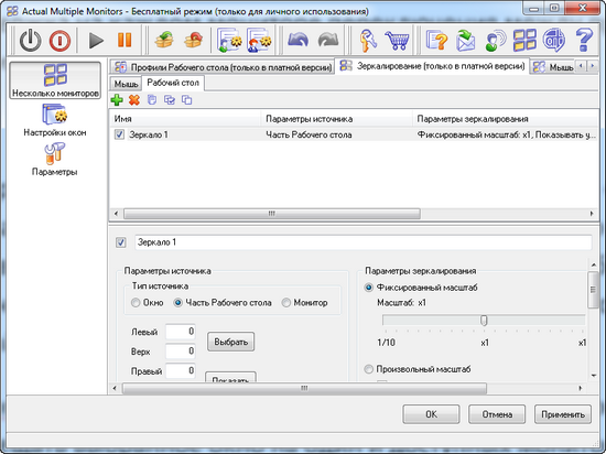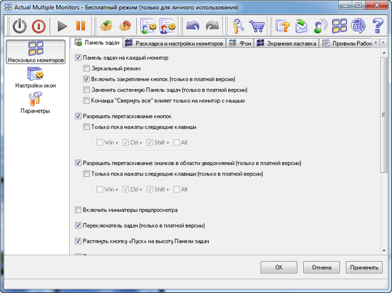 Программа распространяется в двух редакциях: бесплатной, где нет некоторых возможностей, и платной. Полное сравнение редакций доступно по этой ссылке. Чтобы понять, стоит ли платить деньги за shareware-версию, можно поработать с Actual Multiple Monitors в триал-режиме, в котором в течение 30 дней доступны все опции.