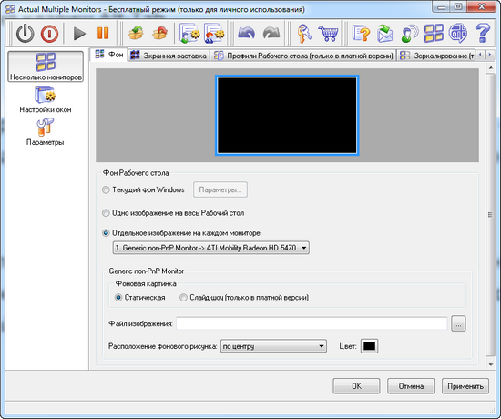 Для каждого из мониторов выбирается разрешение и свой фон рабочего стола, который может быть как статическим, так и изменяющимся (слайд-шоу). Кроме этого, у каждого дисплея может быть отдельный хранитель экрана.