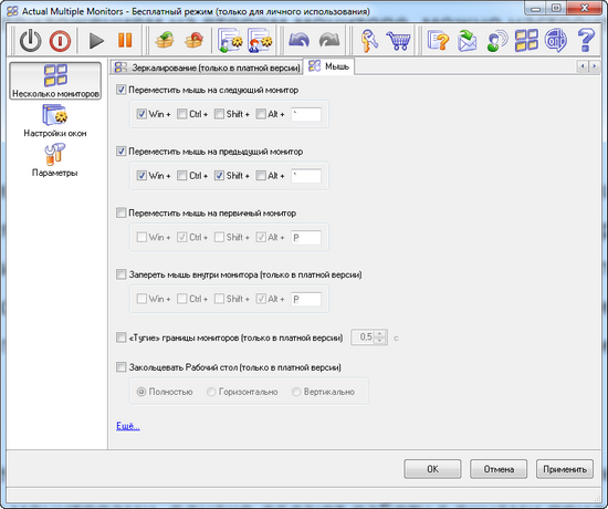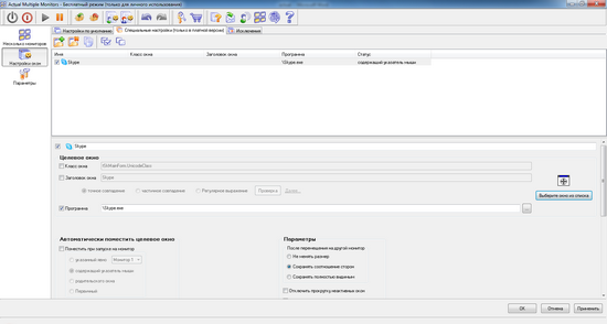 В Actual Multiple Monitors есть и некоторые любопытные опции, которые хоть и не имеют прямого отношения к работе с несколькими мониторами, однако делают работу с окнами приложений намного удобнее. Например, при перемещении окна с помощью мыши за заголовок, можно включить режим эмуляции функции Aero Snap в Windows 7, а также режим классического «прилипания» окна к границам рабочего стола.