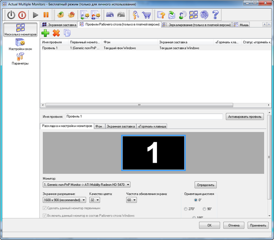 Actual Multiple Monitors дает возможность сохранять в виде профилей разные конфигурации мониторов, включающие настройки разрешения, оформления рабочего стола, хранителя экрана и так далее. Эта возможность может пригодиться тем, у кого время от времени меняется число подключенных к компьютеру мониторов (например, пользователям ноутбуков, иногда подключающим внешний дисплей).