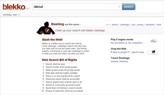 Для того чтобы прояснить свою позицию в интернет-пространстве, создатели blekko разработали собственный «Билль о правах веб-поиска». Поскольку он не слишком длинный, приведем его текст полностью: