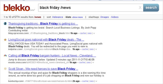 Кроме слештегов, включающих тот или иной список сайтов, в blekko также есть те, которые выполняют определенные функции. Например, слештег /date сортирует результаты поиска по дате. Если вы ищете новые статьи или исследования по какой-то теме, это невероятно удобно. Слештег /likes дает возможность видеть в результатах поиска только те сайты, которые отмечены друзьями пользователя на Facebook✴, а также сортировать результаты по числу «лайков». Для того чтобы работать с этим слештегом, нужно зарегистрироваться в blekko, используя свою учетную запись Facebook✴.