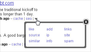 В blekko таких ссылок около десяти, причем их набор время от времени изменяется. Например, когда поисковик был только-только запущен, возле каждой страницы в результатах поиска можно появлялась ссылка chatter, при помощи которой можно было кратко высказать свое мнение о сайте, и также ссылку tag, позволявшую описывать сайт при помощи ключевых слов. В настоящее же время этих ссылок нет, зато есть такие:
