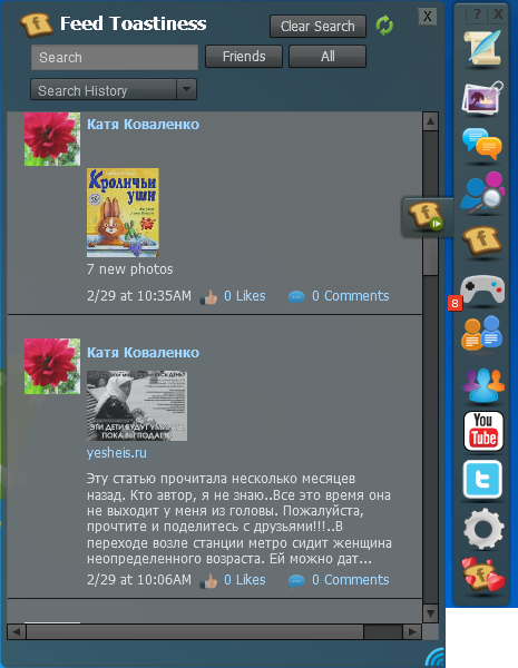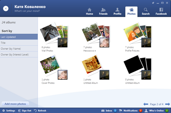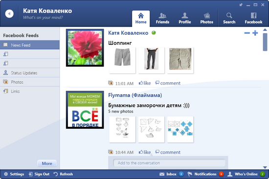 Fishbowl — это клиент для работы с Facebook✴, созданный сотрудниками Microsoft в качестве эксперимента. В настоящее время он уже не поддерживается, но его исходные коды открыты и могут быть использованы другими разработчиками. На первый взгляд, Fishbowl ничем не отличается от Facebook✴ в браузере, кроме немного переработанного интерфейса. В верхней части окна есть вкладки для переключения между основными разделами социальной сети: домашней страницей, профилем, фотографиями, поиском. Слева в окне отображаются доступные действия, которые меняются в зависимости от выбранного раздела. ![]() При помощи Fishbowl удобно просматривать фотографии. В одном окне в виде россыпи изображений представлены и альбомы пользователя, и альбомы друзей. Можно просматривать изображения в полноэкранном режиме, запускать режим слайд-шоу, сохранять картинки на жесткий диск и отправлять их на печать. Кроме этого, в Fishbowl есть простой инструмент для загрузки изображений, позволяющий добавлять фотографии на Facebook✴ простым перетаскиванием файлов в окно Fishbowl. ![]() В нижней части окна клиента можно увидеть количество непрочитанных личных сообщений, число уведомлений и информацию о том, сколько друзей сейчас в онлайне. Уведомления также отображаются прямо на иконке приложения в трее, поэтому, кинув взгляд на нее, можно сразу же узнать, есть ли новые комментарии, записи на стене или личные сообщения. Благодаря интеграции с панелью задач Windows 7 многие действия, например просмотр уведомлений и запуск чата, доступны прямо в списке переходов (Jumplist). Еще одна интересная особенность клиента — мини-режим, в котором Fishbowl представлен в виде небольшого плавающего окошка, где отображается до двухсот последних событий в ленте Facebook✴. Такое представление, с одной стороны, дает возможность держать руку на пульсе событий в социальной сети, а с другой — не мешает основной работе. ![]() В качестве альтернативы Fishbowl можно попробовать еще клиент FlipToast. В отличие от Fishbowl, он не имеет ничего общего с интерфейсом социальной сети. Вместо этого пользователям предлагается небольшая панелька, которая постоянно находится в выбранной части экрана. С ее помощью можно выполнять все основные действия на Facebook✴: обновлять статус, просматривать уведомления, читать ленту новостей и выполнять поиск по сообщениям, общаться с друзьями в чате, публиковать сообщения на стенах друзей, загружать фотографии. Загрузка фотографий выполняется простым перетаскиванием на область Fishbowl. В окне программы можно создавать новые альбомы, но, к сожалению, нельзя устанавливать для них режим видимости. ![]() Общение в чате С тех пор как в пятой версии Skype появилась поддержка Facebook✴, популярный VoIP-клиент стал для большинства пользователей самым простым способом общения с друзьями в соцсети. Чтобы общаться в чате с Facebook-контактами, достаточно перейти на одноименную вкладку в Skype и ввести данные своей учетной записи. После этого Skype подгрузит всех друзей Facebook✴, и можно будет общаться с ними так же, как со Skype-контактами: писать им в текстовом чате, делать обычные и видеозвонки. ![]() Однако, кроме Skype, есть и другие способы «живого» общения с друзьями на Facebook✴. Например, для текстового чата можно использовать очень простую программу fTalk. Как и Skype, она организует список контактов таким образом, что пользователи, находящиеся в онлайне, показываютс