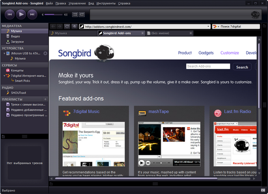 Как и в случае с Firefox, концепция браузера Songbird также позволяет конфигурировать возможности программы с помощью дополнений. Они ставятся автоматически, и после их подключения браузер регулярно следит за обновлениями установленных модулей. Некоторые дополнения загружаются инсталлятором при установке приложения, другие можно найти на официальном сайте проекта.