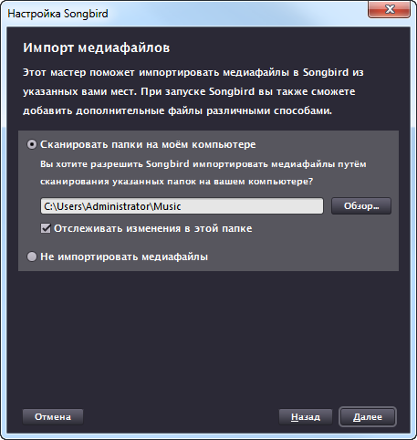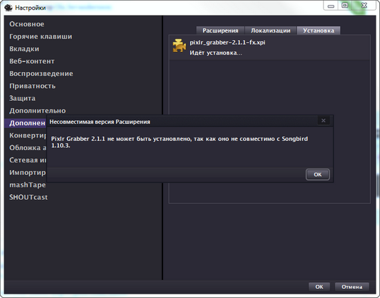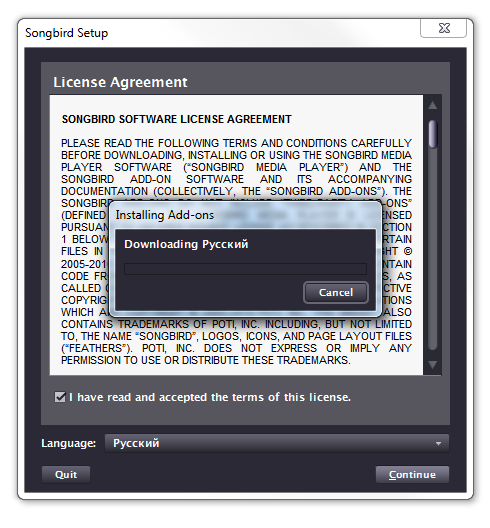 Поддержка языков тоже реализована в виде дополнений. Songbird сам определит, что требуется русский язык, и автоматически скачает языковой модуль.