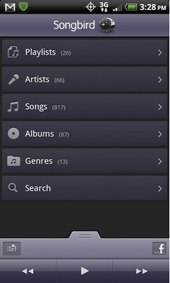 Помимо версии для десктопов, разработчики предлагают также мобильную редакцию плеера для Android, поддерживающую как аудио-, так и видеофайлы. Приятно, что мобильный Songbird, как и старший брат, распространяется бесплатно. Мобильный плеер поддерживает синхронизацию с настольной версией, благодаря чему на Android-устройстве можно, например, воспроизводить созданные на компьютере списки воспроизведения.