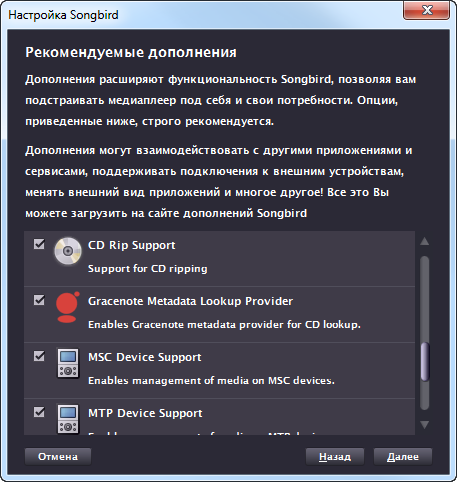 В процессе инсталляции Songbird мастер установки предлагает установить набор дополнений, которые добавят в проигрыватель поддержку популярных онлайновых сервисов: Last.fm, mashTape, Gracenote Metadata Lookup Provider и прочие. Некоторые из модулей, которые автоматически загружаются из Сети, добавляют очень полезные функции, например поддержку воспроизведения защищенных файлов Windows Media Audio, возможность копирования музыки с аудиодисков и так далее.