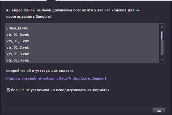 Первое, что делает любой серьезный проигрыватель, — индексирует аудиоколлекцию. Процесс учета мультимедийных файлов в Songbird происходит не бездумно — программа не только определяет наличие музыки, но и анализирует контент на предмет «читабельности». Таким образом, если проигрыватель видит незнакомые файлы, для которых нет соотнесенного кодека, Songbird показывает их и предупреждает о том, что эти данные плееру «не по зубам».
