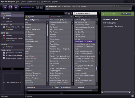 Плеер достаточно «всеяден», он работает с большинством популярных форматов — MP3, AAC, OGG, FLAC, WMA, WAV. К сожалению, Songbird не поддерживает файлы разметки CUE — это его большой минус.